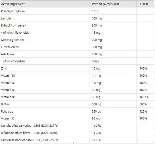 Plantago ovata (psyllium) vezels zijn essentieel voor een goed werkend spijsverteringsstelsel en voor een evenwichtige darmflora, die acne kunnen beïnvloeden. Psyllium kan worden gebruikt bij SIBO en IMO. Het heeft ontstekingsremmende eigenschappen, verzacht huidklachten bij acne, atopische dermatitis en psoriasis, en versnelt wondgenezing. Rijk aan linolzuur (omega-6) en fenolische verbindingen (antioxidanten). Reguleert de spijsvertering en verlaagt cholesterol- en bloedsuikerspiegels. Wetenschappelijk onderzoek laat een verband zien tussen verstoringen in de darmmicrobiota en verergering van huidafwijkingen.
