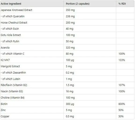 Paardenkastanje-extract, waaronder escine – versterkt bloedvaten en vermindert hun broosheid. Vermindert vaatpermeabiliteit, verhoogt vaatelasticiteit, werkt ontstekingsremmend, stimuleert de circulatie, verbetert de doorbloeding van de huid en vermindert zwellingen.